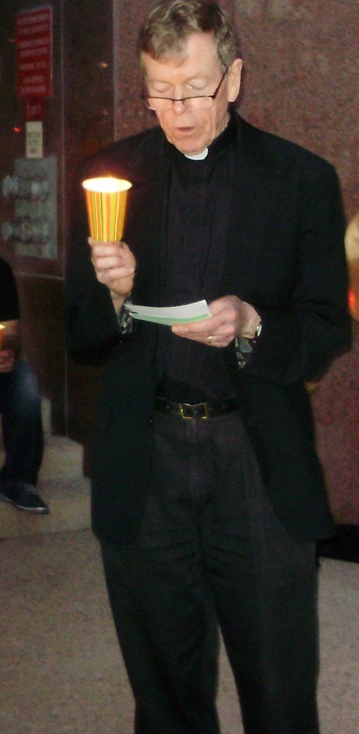 Near the end of the vigil, the crowd, holding their candles in multicolored paper cups, stood along the sidewalk facing the automobile traffic for the passing cars to see them.