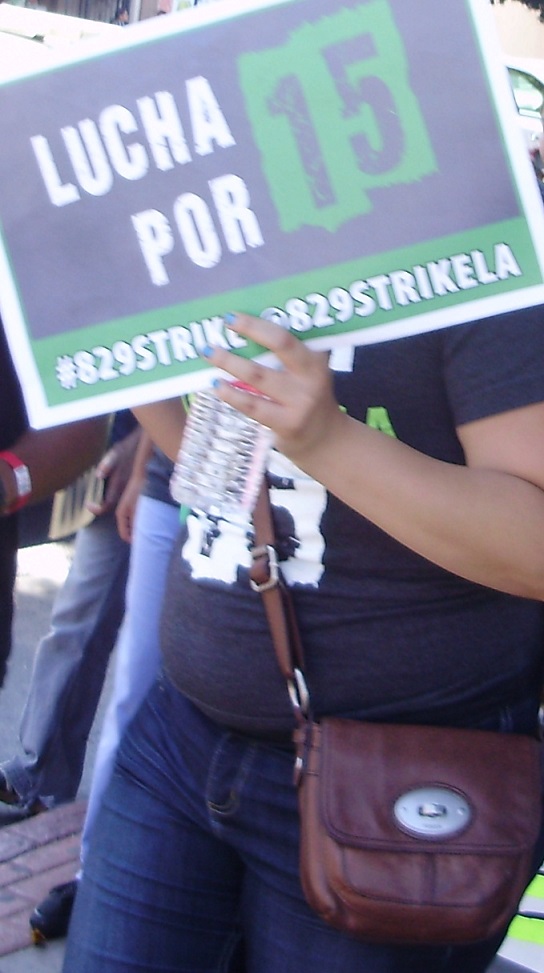 Fast food workers in Los Angeles County went out on a one-day strike on Thursday, August 29, as part of a national effort organized by the Service Employees International Union in more than 50 cities, to raise their pay to $15 an hour. In the late morning in Los Angeles near the corner of Western Ave. and Santa Monica Blvd., more than two hundred strikers and their supporters rallied near the corner of Western Ave. and Romaine Street. After the rally, the crowd marched on the sidewalk north on Western and then through the streets of Hollywood, sometimes bringing their protests inside some fast food restaurants on their route.
