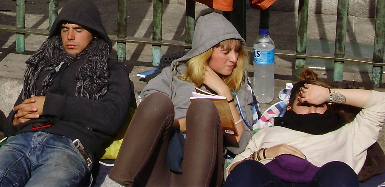 After eating and shopping we walked around the area. We found three protests that evening. The first was a group of pensioners, who were protesting the bailing out of the banks. Each Thursday, they would march in the area. They passed out a small flyer written in Spanish and English. The English version said that “the government of Spain and its banks” have stolen “30 billion euros from elderly people,” which was only from “Bankia,” one of the bailed-out Spanish banks.