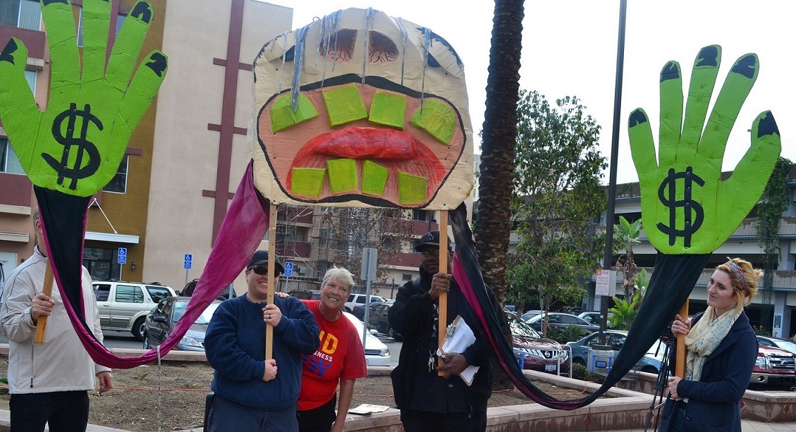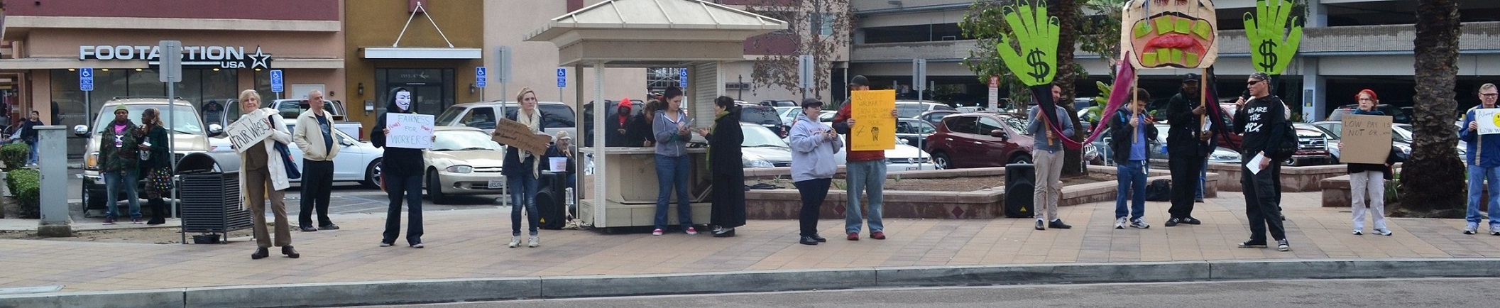 One protester was D. Elizabeth Martin. Martin, who is a practicing lawyer and who once lived in Long Beach but now Orange County, said, “I’m here because we need to start learning that corporate greed and corporate welfare always seems to go unnoticed and it is the poor who pay the price for it and it is the poor who are stigmatized for it. Every Walmart store in the United States costs us on average $500,000 a year between (sic) the taxes lost, the food stamps their employee are qualified for, (and) the state insurance they qualify for. So, the low prices you see are not really low prices. We are all paying taxes to support the low wages of their workers.”