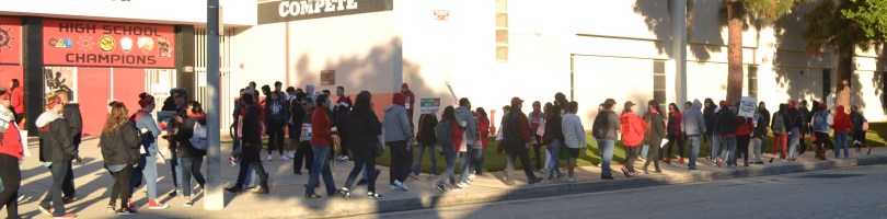 Teachers, students and community allies, Tuesday, Jan. 22, picketing outside of Phineas Banning High School in the Wilmington community of the City of Los Angeles; photo by Barry Saks