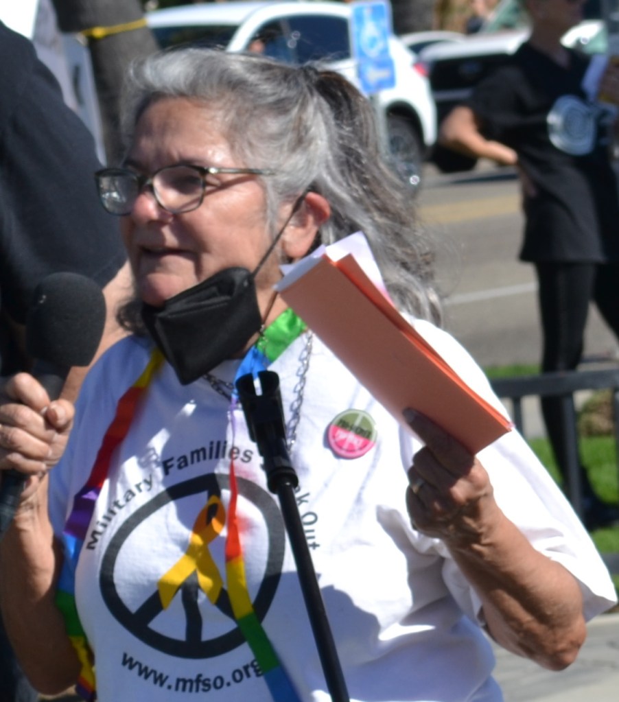 Pat Alviso, the National Coordinator of MFSO, spoke at Lone Sailor Memorial. She said, “Earlier I said Nov. 11 is painful (for) me as I’m sure it is to other victims of war because I still can’t look away from all the faces of the young recruits (that) I have to witness at the endless color-guard ceremonies going on today and I flash back to my 18-year-old son’s innocent face as he was marching off to a war which he actually thought would be helping the Afghan people… Instead, he returned, like so many others completely demoralized because he ended up knocking down the doors of the homes of terrorized families, mostly women and children, and getting flipped off by those very same children.”