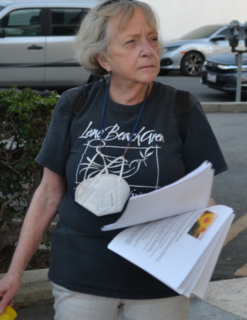 The marchers gathered near the corner of Corona Ave. and East Second St. One marcher near the corner was Naida Tushnet, a longtime LBAPN activist. Regarding the tension between unconditional support for self-determination for Ukraine and LBAPN’s opposition to a no-fly zone and to providing U.S. arms to the Ukrainians, Tushnet said she opposed the no-fly zone to avoid a nuclear war with Russia. Tushnet, who is also a longtime activist in the local Democratic Party, said, “We want to end the (U.S.) military-industrial complex is part of the issue that we (LBAPN) is trying to get at…in the statement.”