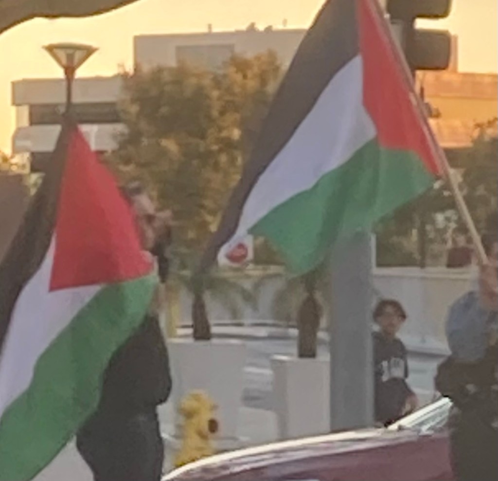 One protester, a veteran of the U.S. Army was Juan. Juan, 51, took public transportation, wearing his black-and-white keffiyeh, from Los Angeles to the park. On the bus to Bixby Park, he said, “I support Palestine. It’s not right what Israel is doing. No one has the right to steal someone else’s land.” He added he thought Zionism is a racist ideology.